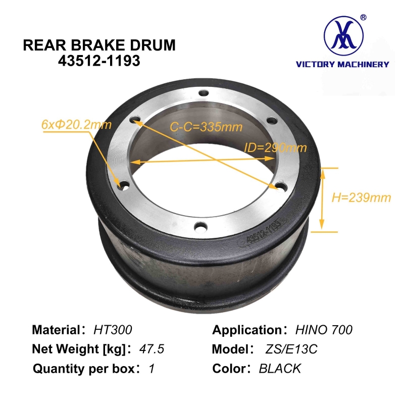 Peças de caminhão japonesas 43512-1193 Tambor de freio traseiro com 6 furos para Hino 700 ZS E13C 435121023
